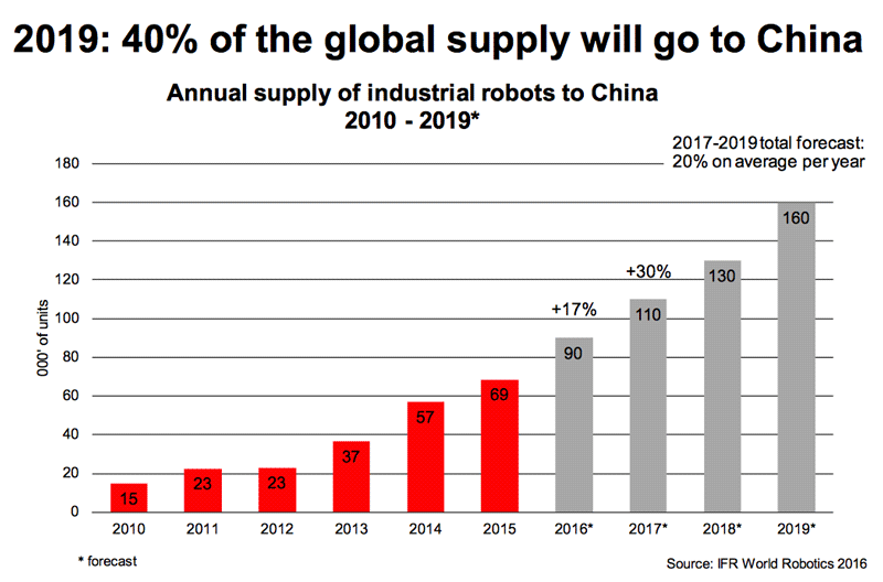 中国国家主席习近平提出了“机器人革命”的口号,并启动了“中国制造2025”计划。根据中国工业和信息化部2016年的一份报告,已经出现了1000多家公司以及一个新的机器人协会CRIA(中国机器人产业联盟)(或开始转型)涉足机器人领域,以充分利用该计划的优势。与此相反,根据同一份报告,十年前该行业几乎不存在。