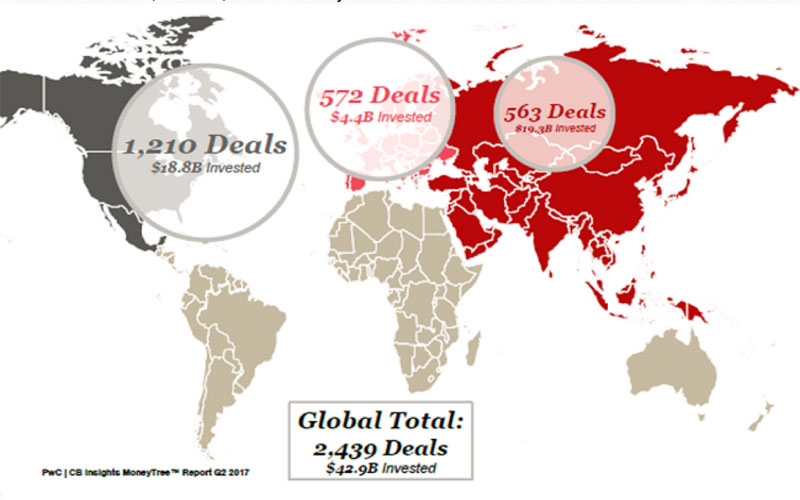 近期,亚洲科技初创企业的融资规模已经超过了2017年同期北美地区的规模。根据PwC和CB Insights的数据,2017年上半年亚洲的创投投资总额达到了288亿美元,而北美地区同期的投资总额为184亿美元。