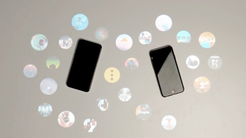 您可以点击圆圈来播放一首歌曲。当您的朋友来访时,他们只需将自己的手机放置下来,他们喜欢的音乐也会投射到表面上。共同喜爱的专辑将以大气泡形式显示,而个人选择则较小。